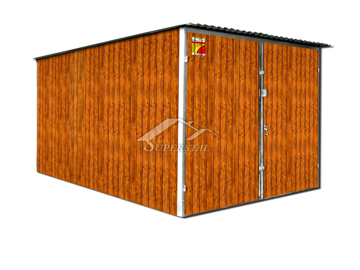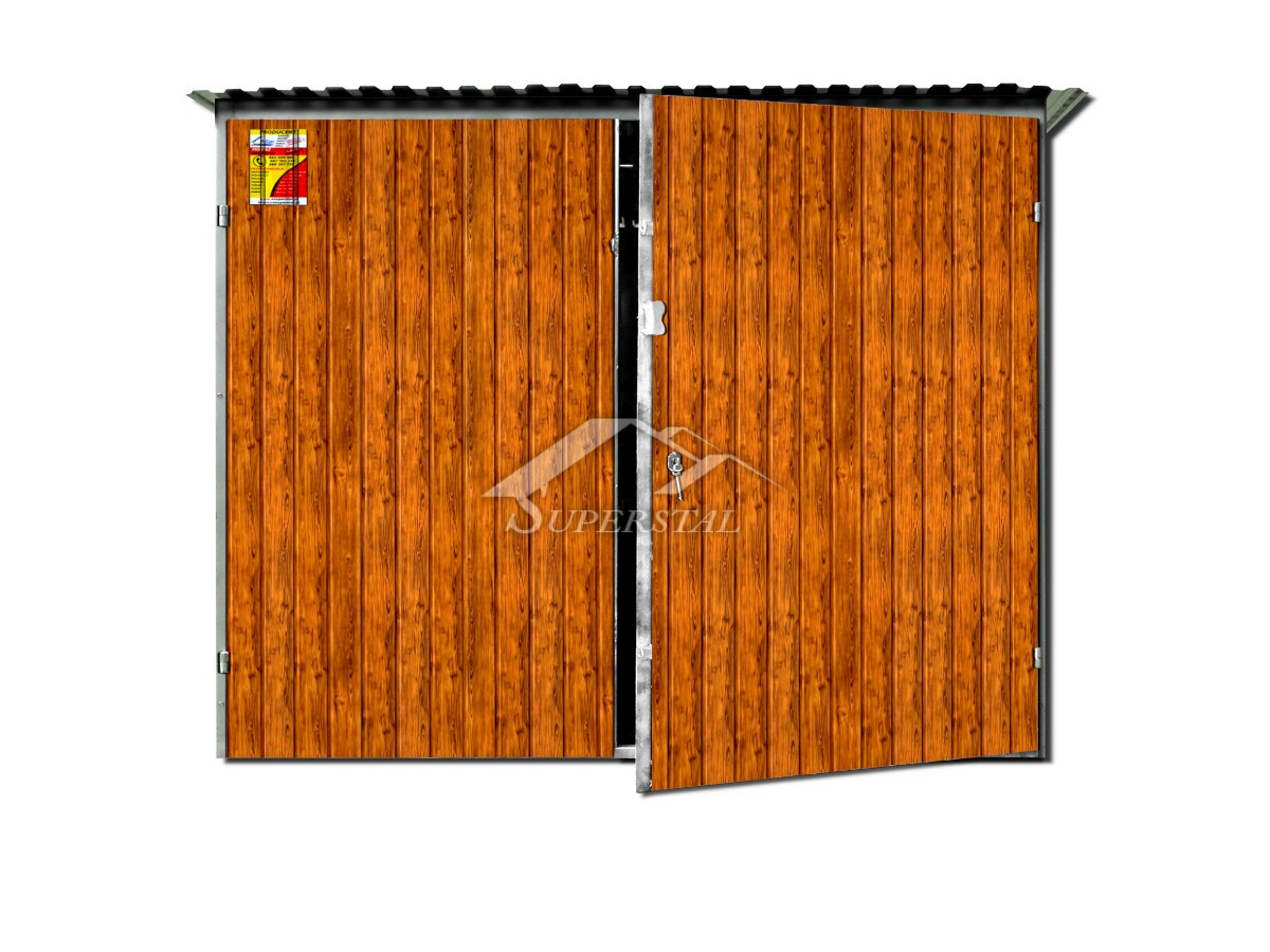 FAMINTÁS LEMEZGARÁZS 2x2 , HÁTRA LEJTŐ TETŐ, KÉTSZÁRNYÚ KAPULemezgarázs famintás lemezborítással a természetbe beolvadó színvilág és praktikus fémtermékek kedvelőinek!