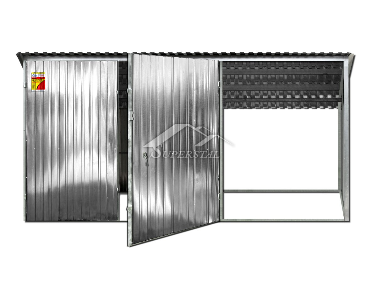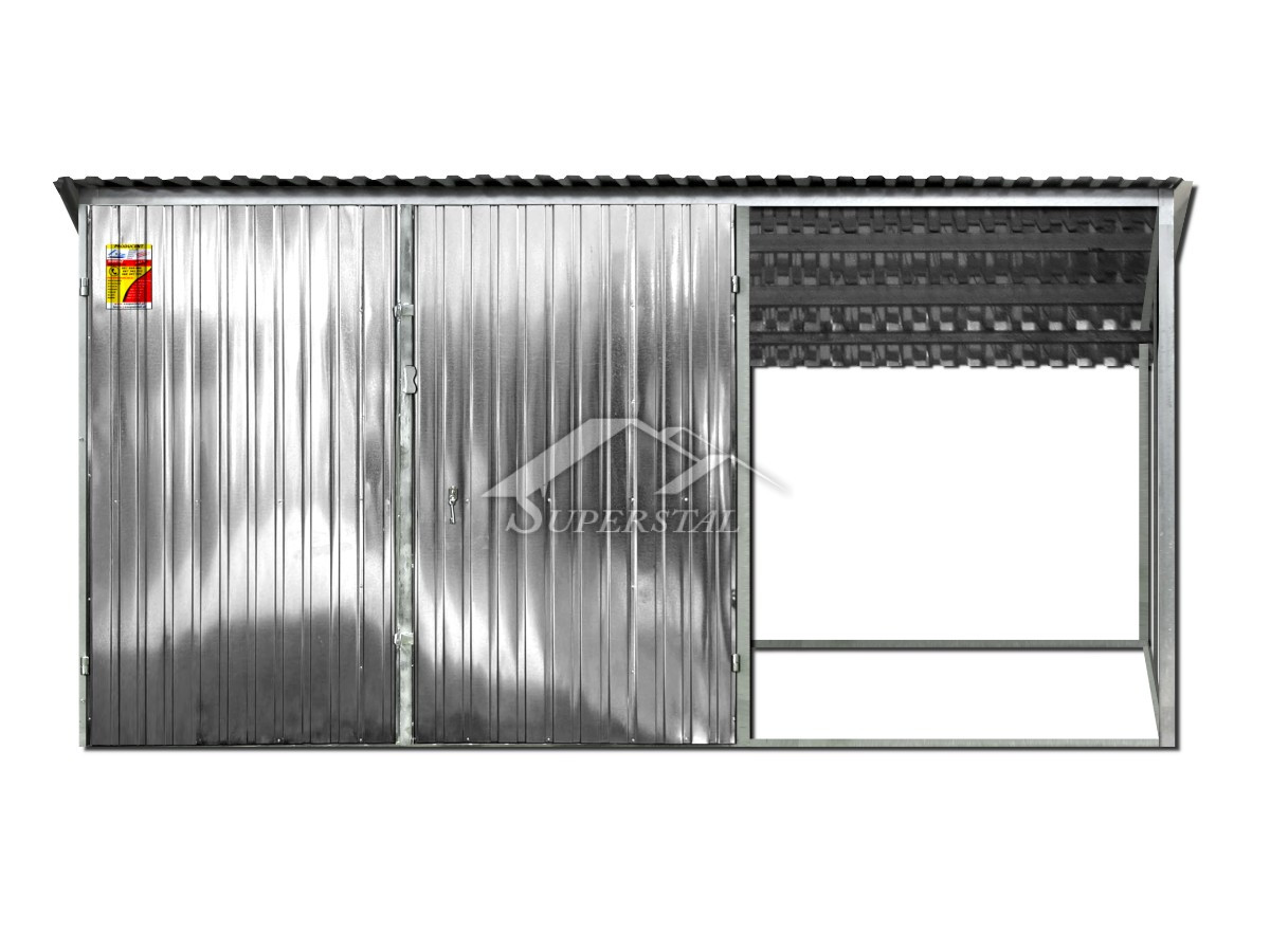 HORGANYZOTT LEMEZGARÁZS FEDETT TÁROLÓVAL 5X6 - HÁTRA LEJTŐ TETŐVEL KÉTSZÁRNYAÚ KAPUVALA horganyzott lemezgarázs egyszerű és pénztárcabarát megoldást kínál, gépjárművek és más fedett tárolást igénylő pl. kertiszerszámok tárolására!