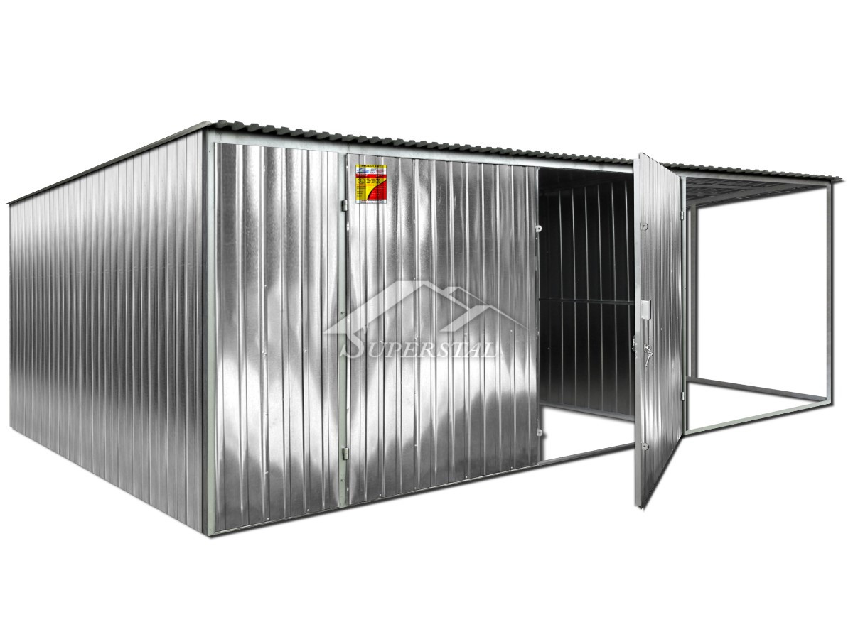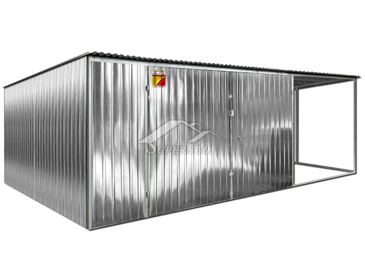 HORGANYZOTT LEMEZGARÁZS FEDETT TÁROLÓVAL 6X6 - HÁTRA LEJTŐ TETŐVEL KÉTSZÁRNYAÚ KAPUVALA horganyzott lemezgarázs egyszerű és pénztárcabarát megoldást kínál, gépjárművek és más fedett tárolást igénylő pl. kertiszerszámok tárolására!