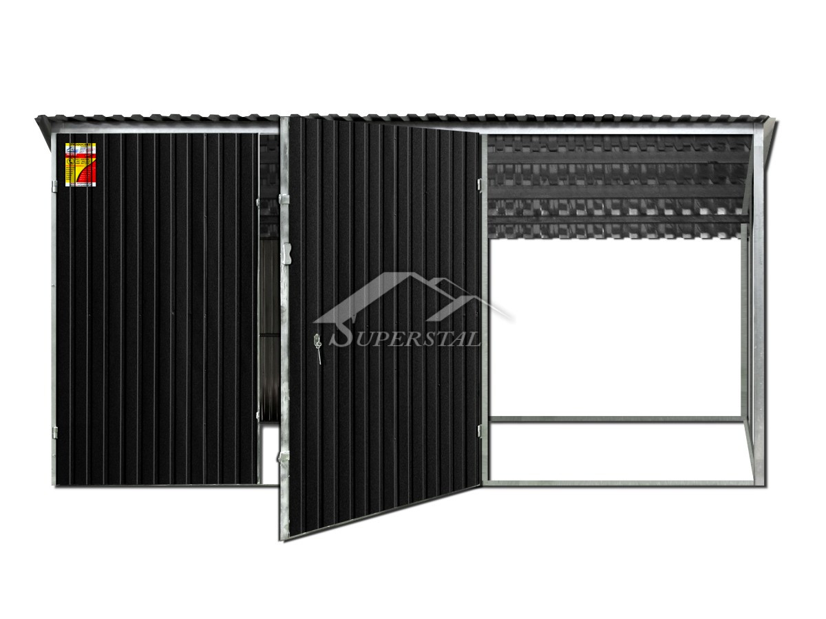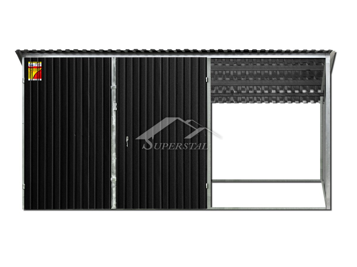 SZÍNES LEMEZGARÁZS FEDETT TÁROLÓVAL 5X6 - HÁTRA LEJTŐ TETŐVEL KÉTSZÁRNYAÚ KAPUVALA horganyzott lemezgarázs egyszerű és pénztárcabarát megoldást kínál, gépjárművek és más fedett tárolást igénylő pl. kertiszerszámok tárolására!