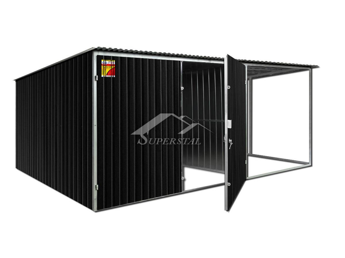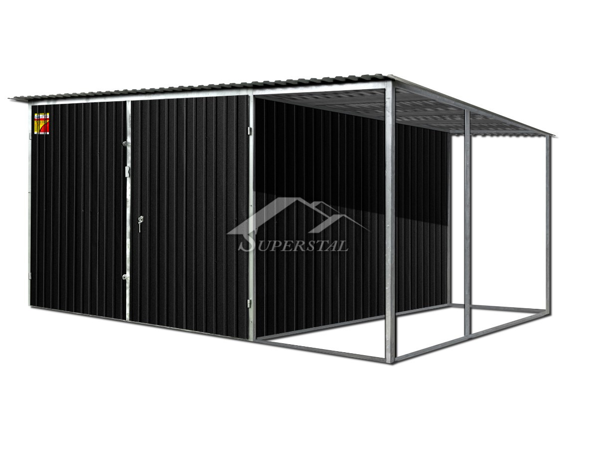 SZÍNES LEMEZGARÁZS FEDETT TÁROLÓVAL 5X7 - HÁTRA LEJTŐ TETŐVEL KÉTSZÁRNYAÚ KAPUVALA horganyzott lemezgarázs egyszerű és pénztárcabarát megoldást kínál, gépjárművek és más fedett tárolást igénylő pl. kertiszerszámok tárolására!