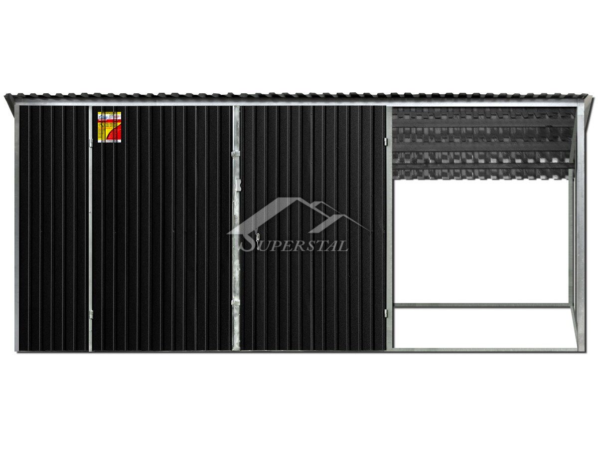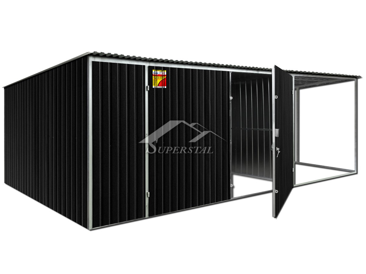 SZÍNES LEMEZGARÁZS FEDETT TÁROLÓVAL 6X5 - HÁTRA LEJTŐ TETŐVEL KÉTSZÁRNYAÚ KAPUVALA horganyzott lemezgarázs egyszerű és pénztárcabarát megoldást kínál, gépjárművek és más fedett tárolást igénylő pl. kertiszerszámok tárolására!