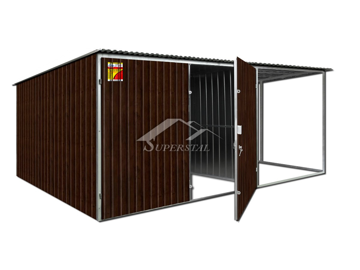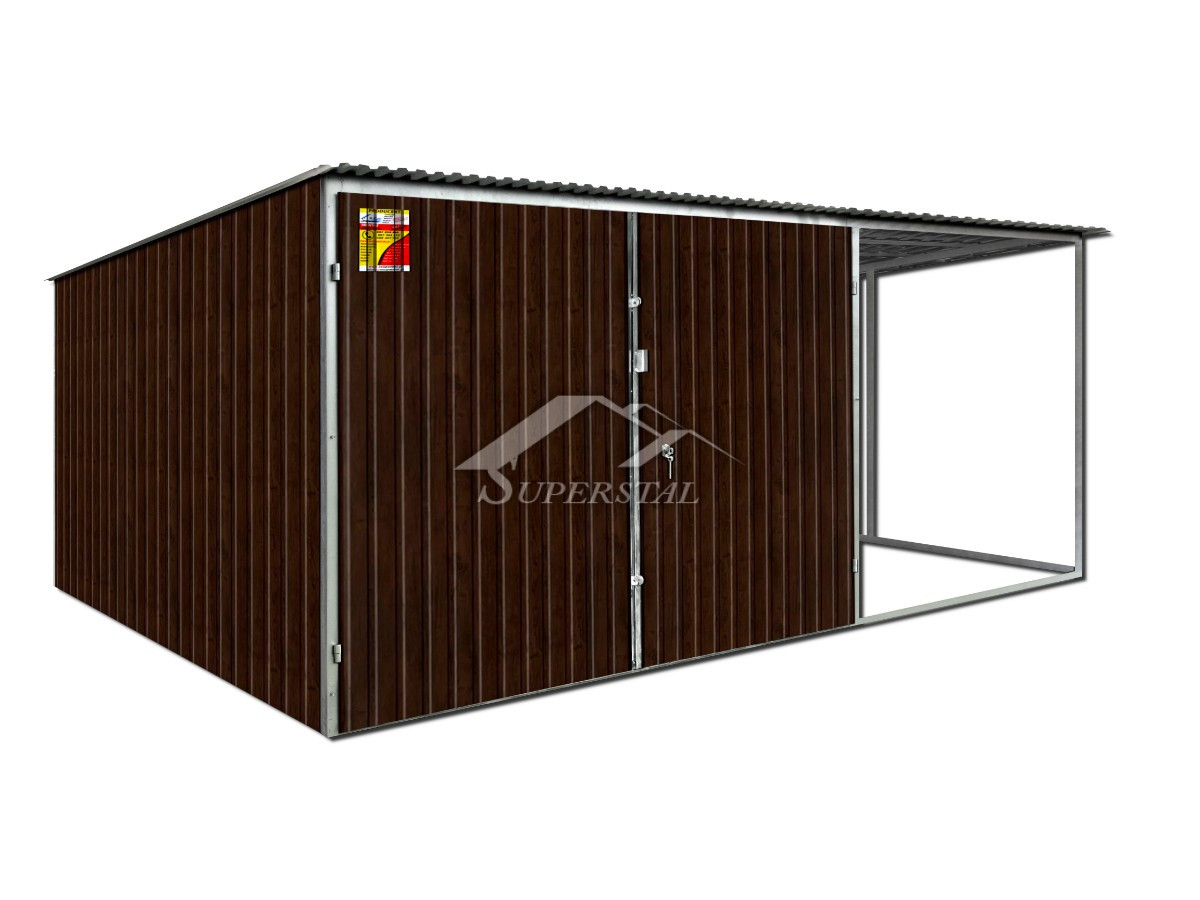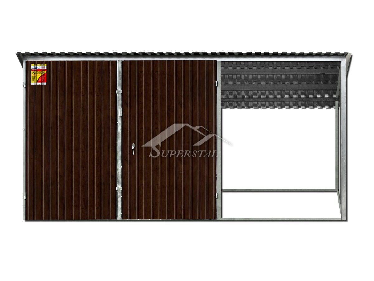 FAMINTÁS LEMEZGARÁZS FEDETT TÁROLÓVAL 5X5 - HÁTRA LEJTŐ TETŐVEL KÉTSZÁRNYAÚ KAPUVALA horganyzott lemezgarázs egyszerű és pénztárcabarát megoldást kínál, gépjárművek és más fedett tárolást igénylő pl. kertiszerszámok tárolására!