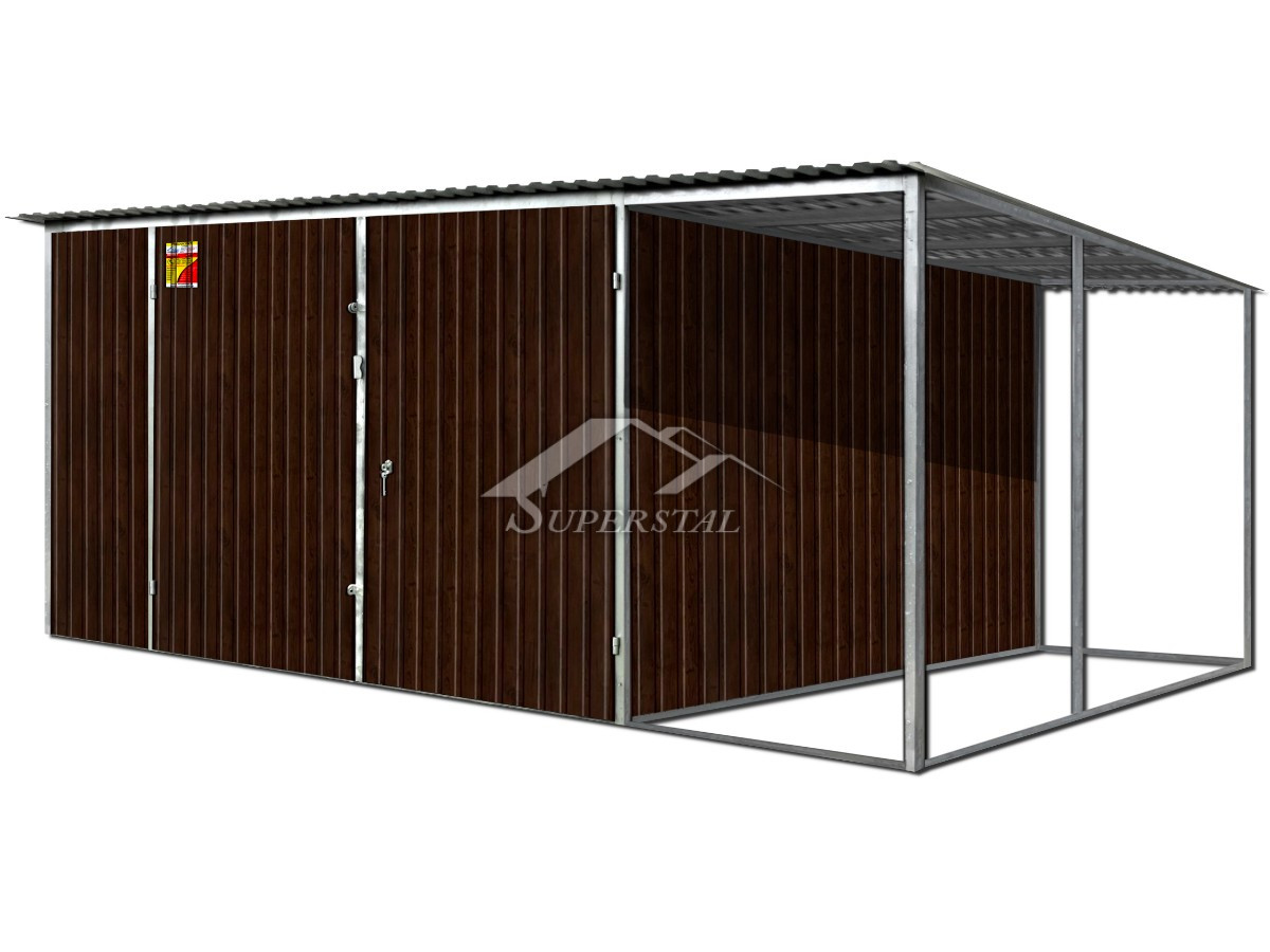 FAMINTÁS LEMEZGARÁZS FEDETT TÁROLÓVAL 6X5 - HÁTRA LEJTŐ TETŐVEL KÉTSZÁRNYAÚ KAPUVALA horganyzott lemezgarázs egyszerű és pénztárcabarát megoldást kínál, gépjárművek és más fedett tárolást igénylő pl. kertiszerszámok tárolására!