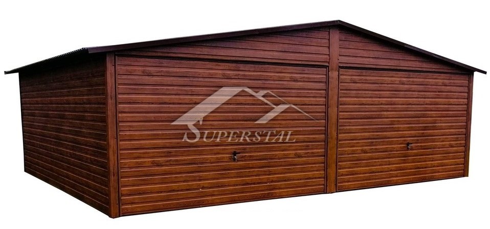 Lemezgarázs ALFA 6x5m famintás két oldalra lejtő tetővel, billenő kapuval.
