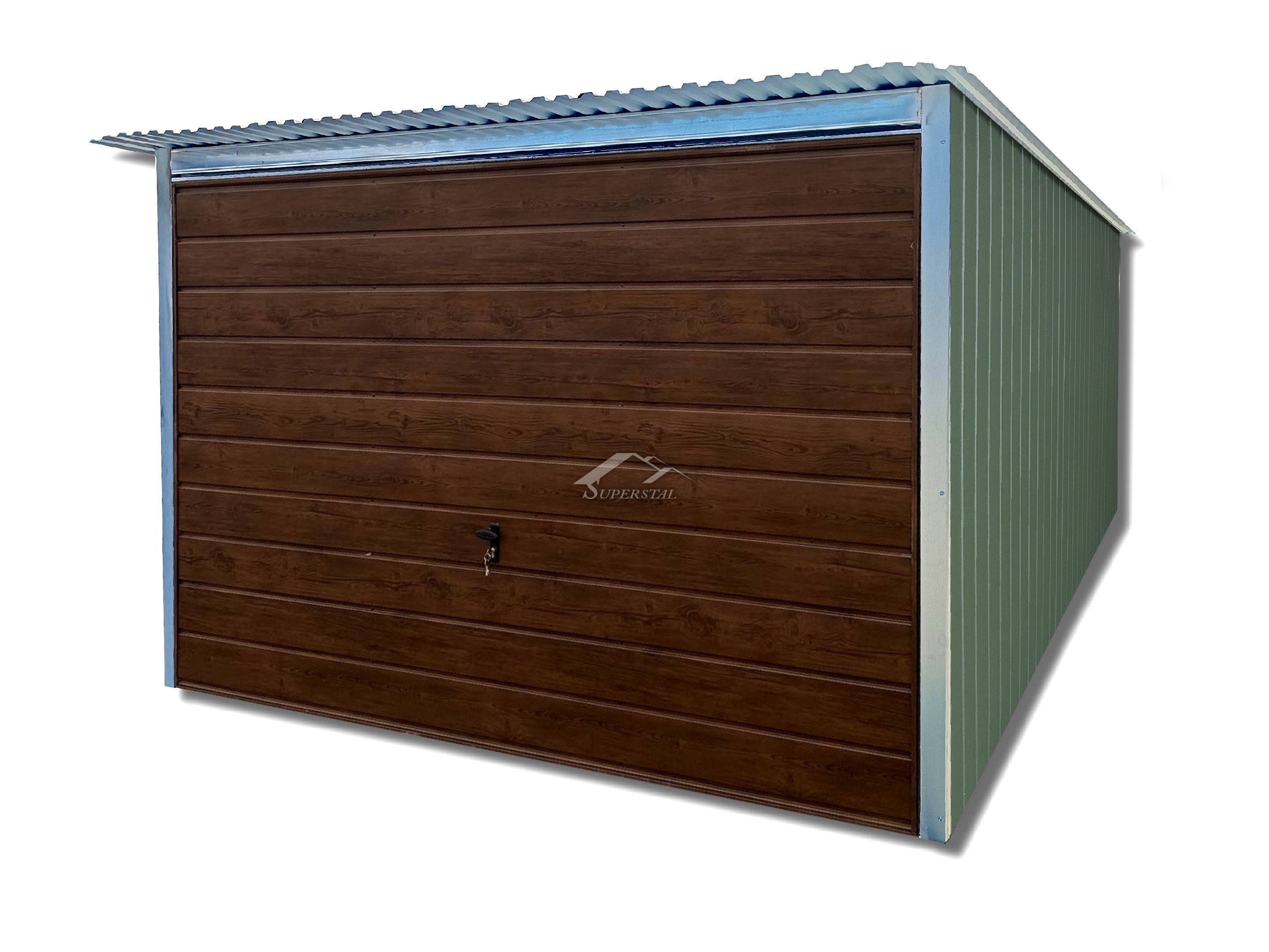Lemez garázs 3x5m akril színes hátra lejtő tetővel, famintás billenő kapuval. ( szélesen barázdált panellal )