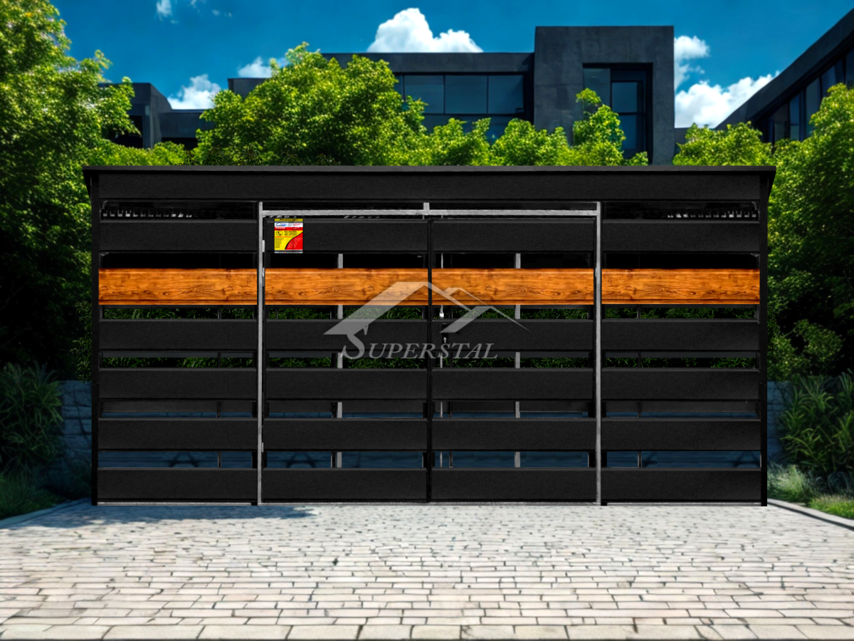 SZEMETESKUKA TÁROLÓ SMK 4,5X3 , DUPLASZÁRNYAS KAPUVAL, VÍZSZINTES PANELLAL MATT FEKETE SZÍNBEN FAMINTÁS BETÉTTEL