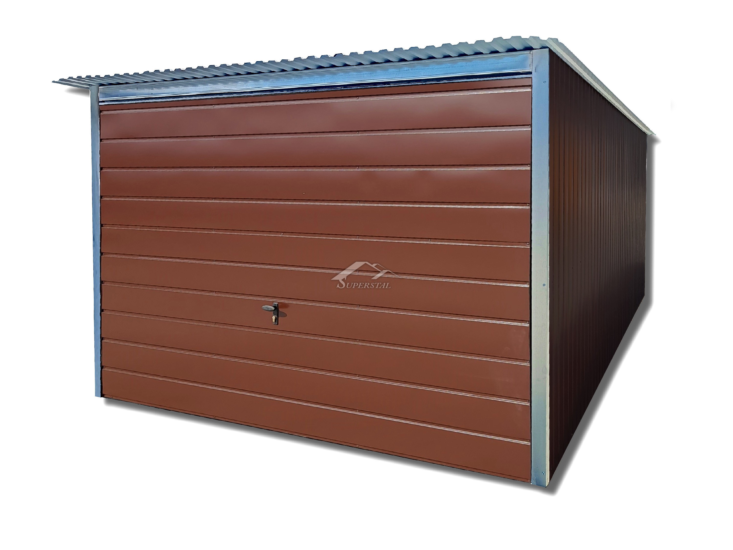 Az egész garázs szerkezet I. osztályú színes lemezzel borítva, barna szinű szegecsekkel rögzítve a szerkezethez.